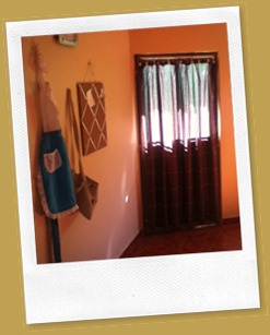 ^ Looking out from the kitchen to the front door. Off to the right is the dinning/living room. Here there are more than a few nails in the wall and holes where nails have been, but we are not aloud to make our own, so we have become creative with the existing ones. There are four by the door, where we have a clock, my apron, a bulletin board, and a spare one for keys, scarfs, or a purse.